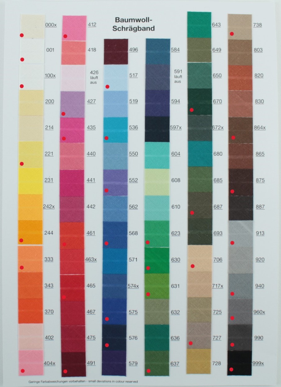 000 rohweiß, 001 natur, 100 weiß, 221 hellgelb, 244 hellorange, 333 apricot, 404 rose, 412 altrosa, 427 flieder, 435 fuchsia, 461 hellrot, 465 rot, 491 weinrot, 517 hellblau, 536 türkis, 552 violett, 568 blau, 575 royalblau, 576 marine, 623 hellgrün, 630 grasgrün, 631 moosgrün, 637 olivgrün, 738 beige, 864 tabak, 875 dunkelbraun, 913 hellgrau, 940 grau, 960 mausgrau, 990 dunkelgrau, 999 schwarz