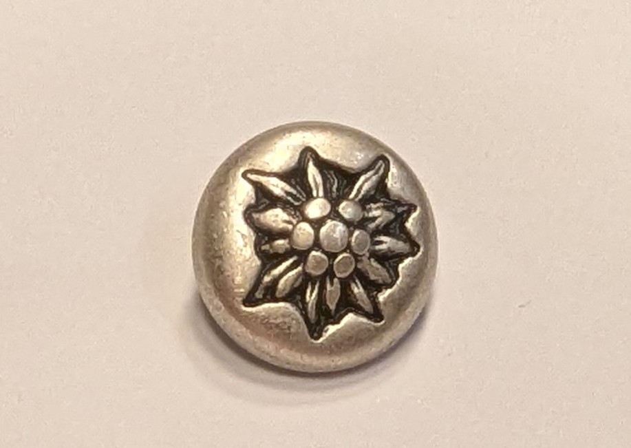 Knopf in Metalloptik mit einem auffälligen Edelweiß-Muster.