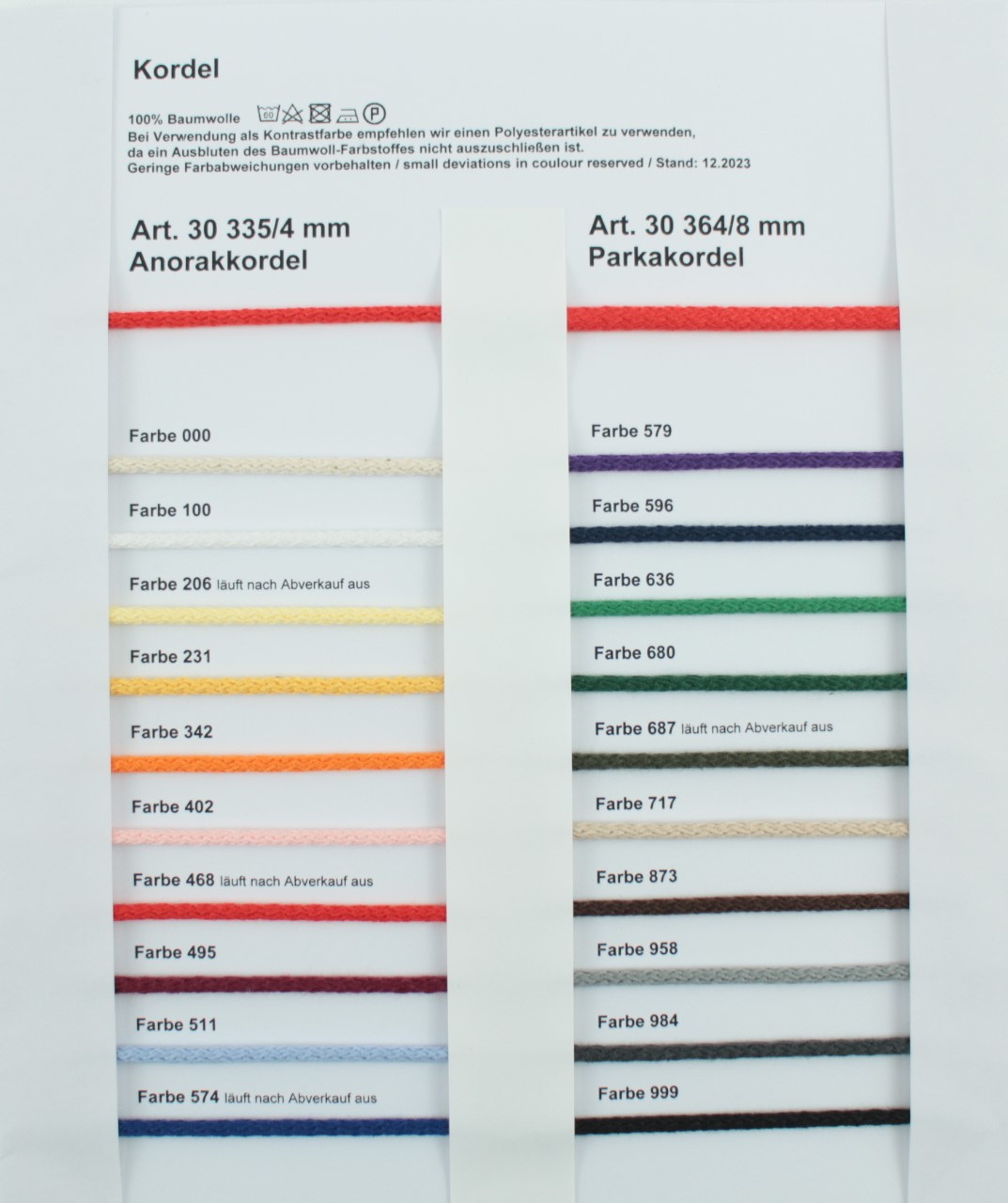 | Farbe | 100 weiß, 000 creme, 206 hellgelb, 231 gelb, 342 orange, 402 rosé, 468 rot, 495 dunkelrot, 511 hellblau, 574 royal, 495 pflaume, 636 grün, 687 oliv, 873 braun, 958 mittelgrau, 984 dunkelgrau, 999 schwarz |
